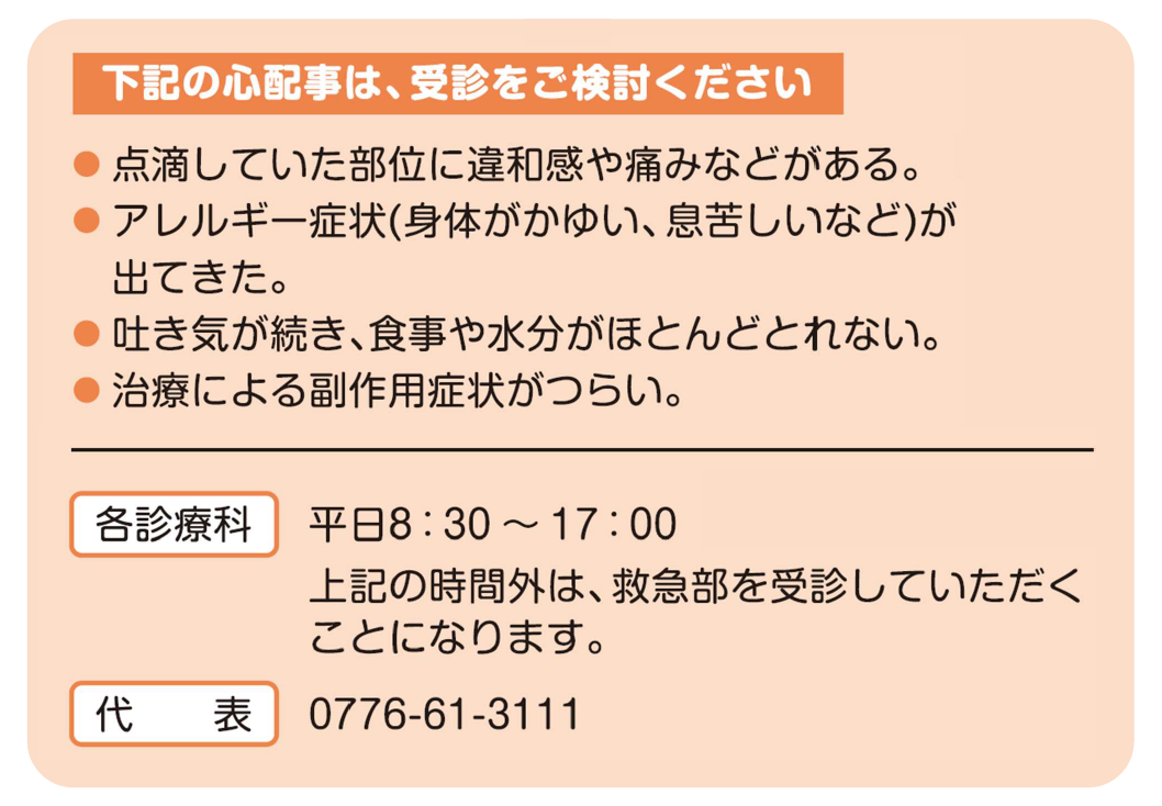 事前に指示された化学療法のレジメンは、前日までに薬剤師や看護師により投与スケジュールをはじめ、投与量、投与時間、支持療法について十分なチェックを受け、投与経路から使用する器材まで綿密なチェックと準備を行っています。