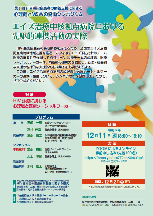 本院では、令和6年12月11日(水)に第1回HIV感染症患者の療養支援に関する心理職とMSWの協働シンポジウムを開催します。是非ご参加ください。