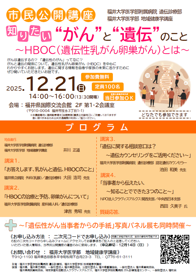 本院遺伝診療部では、令和7年12月21日(日)に市民公開講座を開催します。