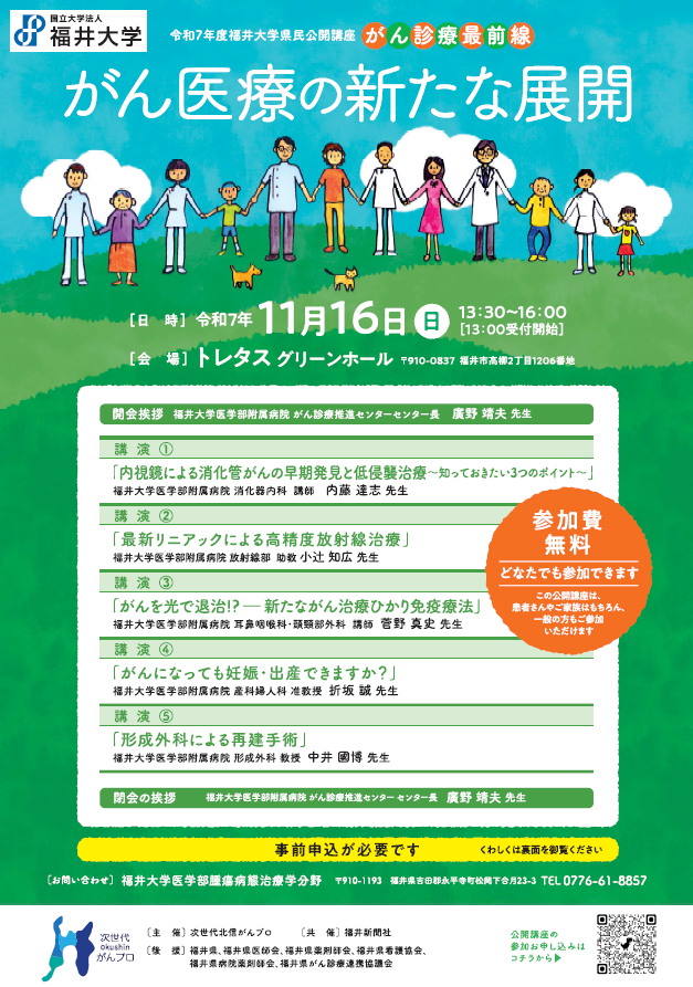 次世代北信がんプロでは、令和7年11月16日(日)に、県民公開講座「がん診療最前線」を開催します。是非ご参加ください。