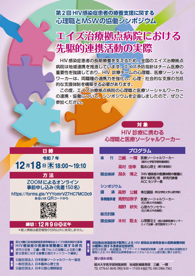 本院では、令和7年12月18日(木)に第2回HIV感染症患者の療養支援に関する心理職とMSWの協働シンポジウムを開催します。是非ご参加ください。