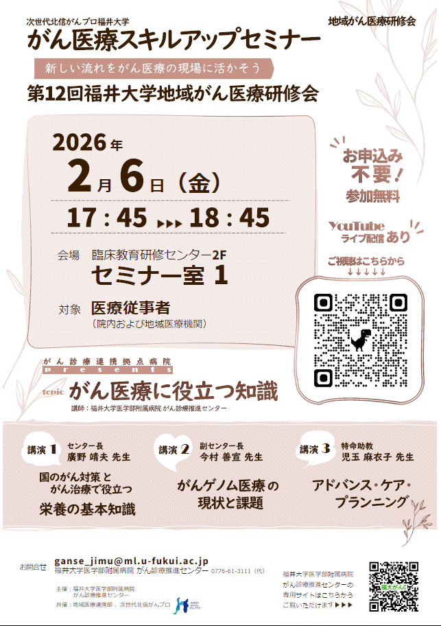 本院がん診療推進センターでは、令和8年2月6日(金)に第12回福井大学地域がん医療研修会を開催します。是非ご参加ください。
