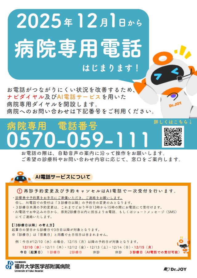 代表電話(0776-61-3111)の混雑解消とより迅速なご案内のため、新たに病院専用電話(0570-059-111)を開設し、併せて、ナビダイヤルおよびAI電話サービスを導入いたします。 長らくご利用いただいた番号からの切り替えとなり、ご不便をおかけしますが、円滑な対応に向けた取り組みへのご理解とご協力をお願いいたします。